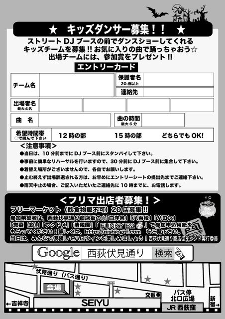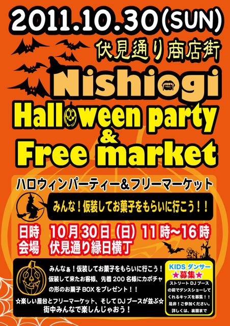 西荻伏見通り西荻ハロウィン&KIDSダンスパーティー&フリーマーケット開催! 今年もやります楽しい縁日! 日時 2011年10月30日(日)11時〜16時 会場 伏見通り縁日横町 今年も仮装して来て下さった方、 先着200名様に カボチャのバケツに アメちゃん詰め放題!! みんな仮装して参加しよう ☆楽しい屋台とフリーマーケット、そしてDJブースが並ぶ☆ 街中みんなで楽しんじゃおう! <KIDSダンサーチーム募集!!> ストリートDJブースの前でダンスショーしてくれるキッズチームを募集!! お気に入りの曲で踊っ