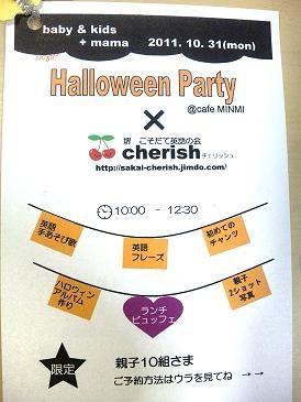 北区で子育て中のママさんにお知らせです 10/31(月)と言えば・・・ そうですっ ハロウィンですよね このたび、新金岡で活動中の堺こそだて英語の会cherishが ハロウィンイベントとして、 ランチ付き★こそだて英語レッスン@cafe MINMI を開催することになりました。 *********************************************************************** 定員 親子10組のうち、残り組となりましたので、 このコミュニティで先着順にて申し込み受付をさ