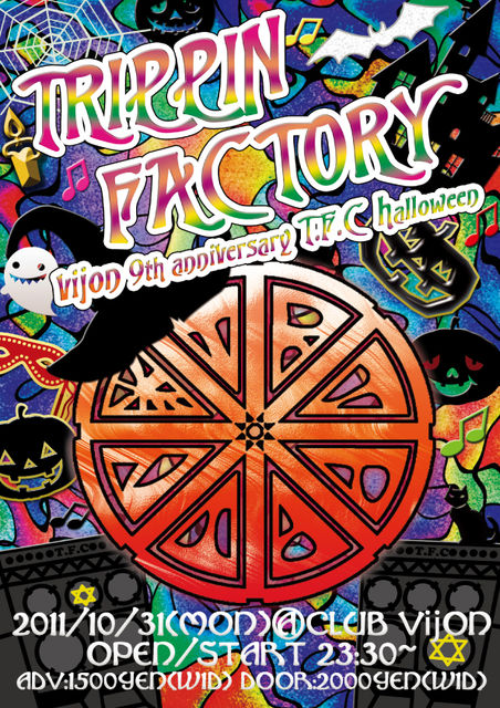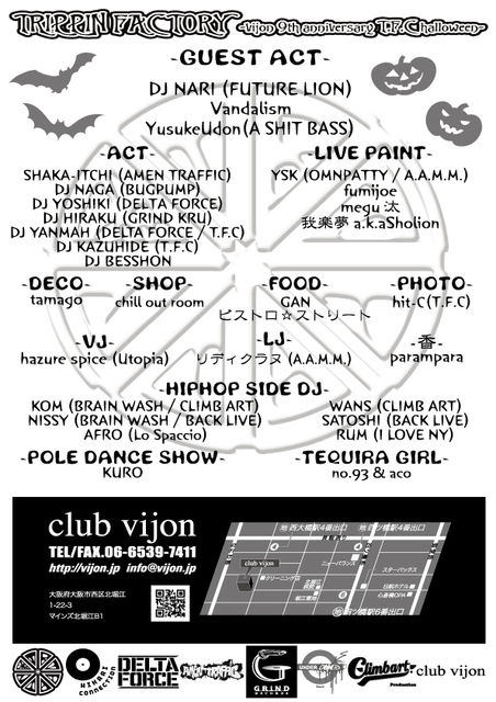 告知失礼致します!!! OSAKA UNDERGROUND TRIPPIN PARTY!!!!! DRUM'N'BASS,UNDERGROUND HIPHOPメインの2FLOORに、 DUBSTEP,JUNGLE,BREAK CORE,ELECTRO, REGGAE and More!!! +LIVE PAINT,FOOD,SHOP,PHOTO,VJ,LJ!!!!! 今回はGUESTに、DJ NARI,Vandalism,YusukeUdon!!!!! 2011.10.31 HALLOWEEN NIGHT @ VIJON!!!!!! 【TRIPPIN FACTORY -vijon 9th anniversary T.F.C halloween-】 2011/10/31(MON)@CLUB VIJON OPEN/START 23:30〜 ADV:1500yen(w1D) DOOR:2000yen(w1D) -GUEST ACT- DJ NARI (FUTURE LION) Va