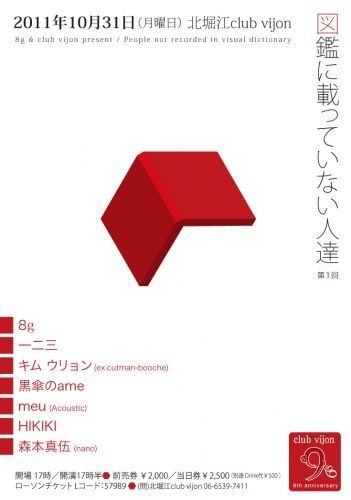 『8g & club vijon present [図鑑に載っていない人達 no.1]』 http://vijon.jp/live.html?ItemId=15694&y=2011&m=10&d=31&action=form 10月31日(月) ばしょ大阪 北堀江club vijon http://vijon.jp/access.html open 17:00 start 17:30 adv 2000yen/door 2500yen (1drink別) ◯LIVE◯ 8g キム ウリョン (ex.cutmanbooche) 黒傘のame meu (Acoustic) HIKIKI 森本真伍(nano) 一二三 (一二三の出演時間は19:30~20:00を予定しています。) ●お問い合わせ・ご予約● club vijon 06-6539-7411 club