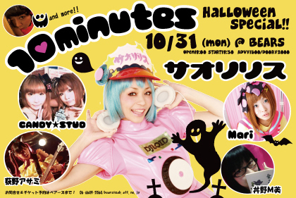 10月31日(月)@難波ベアーズ <10minutes・ハロウィンSPECIAL> サオリリス CANDY★STUD 荻野アサミ 茉里 丼野M美 ねみ and more!!! open18:00 start18:30 adv \1500 door\2000 噂のアイドルイベント「10minutes」。今回は特別番外編!!! スペシャルゲストにveryveryキュートなコスプレ+アニソン+DJ「サオリリス」を迎え、ハロウィンパーティー!!!! ハロウィンはベアーズで? 来てにゃ(@▽@)