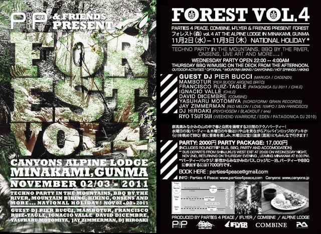 今週の11.02(水)フォレストのパーティーやります! Parties 4 Peace, I-FLYER, COMBINE & friends present FOREST フォレスト(森) vol. 4 at the Alpine Lodge in Minakami, Gunma 11月2日(水)-- 11月3日(木)*National Holiday * ... NEW VIDEO HERE > FOREST VOL 4 LINEUP ( 2 days of music in the mountains ... ) GUEST PIER BUCCI (MARUCA / CADENZA / CROSSTOWN REBELS) LIVE MAMBOTUR (PIER BUCCI/ ARGENIS BRITO) FRANCISCO RUIZ-TAGLE (PATAGONICA DJ 2011 / CHILE) RYO TSUTSUI (WEEKEND WARRIORZ / PATA