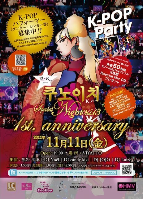 いつも【Kノ一NIGHT】をご愛顧いただきまして 誠にありがとうございます いよいよ【今夜】となりました 11年11月11日 が個も並んだ “SPECIALポッキーの日”は 【Kノ一NIGHT 1周年】です いつもにまして多数のお問い合わせ、 ご予約のメッセージをいただきまして 誠にありがとうございます まだご来場を迷われている方 予約のメッセージをお忘れになったうっかりさんの方 フライヤーをお探しいただいても見つからなかった方 本日入口にて【mi