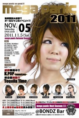 【mega panic 2011】 「クラヴァーが熱狂する1年を締めくくるフィナーレシーズン2011年[秋]の総決算 !!」 mega panic Autumn Season !! -Next Season ?- 札幌21世紀初の 無制限飲み放題 !! 週末オールジャンル !! オンリーワン !! レギュラーイベント !! スタッフ一同、総力を挙げて「BONDZ Bar」にて開催 !! ■日時 (Date) 2011年11月5日(土) OPEN 20:00/START 20:30 ■料金 (Fee) 料金が更にお得になりました !! Price Down !! 史上最安値を更に更新 !! (ADV)前売り men¥2,000 woman