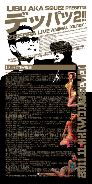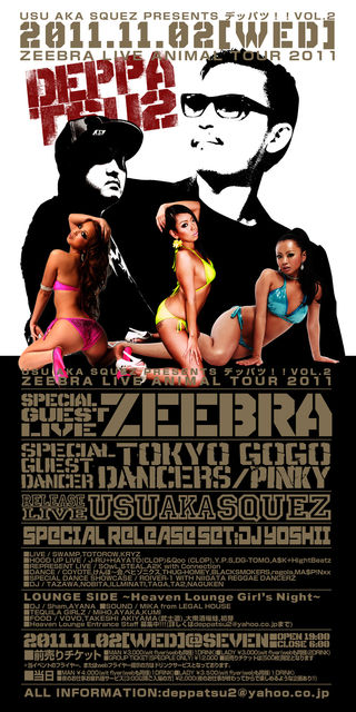 デッパツ!!VOL2 Zeebra The Live Animal Club our 2011 ■開場 CLUB SEVEN ■OPEN 19:00 ■CLOSE 6:00 ■前売りチケット(LIMITED 500) MEN \3.000(wit flyer(webも同様) 1DRINK) LADY \3.000(wit flyer(webも同様) 2DRINK) GROUP TICKET(5PERSONS ONLY) \12.000 *当イベントのフライヤー、またはwebフライヤー提示の方はドリンクサービスとなっております。 ■当日 MEN \4.000(wit flyer(webも同様) 1DRINK) LADY \3.500(wit flyer(webも同様) 1DRINK) ■夜のお仕事お疲れ様サービス 3:00以降入場の方は2.000円でご入場出来ます。 (今回デッ
