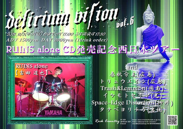 11/3(木祝) 『Delirium Vision vol.6』 【RUINS alone CD発売記念西日本ツアー】 OPEN 17:00 START 17:30 adv 1500円 day 2000円(1dr代別) 【ACT】 ☆RUINS alone 吉田 達也 ☆春秋分点(広島) ☆トリュウエイシ(広島) ☆Trash & Lemmon(周南) ☆イケモトセイヤ(光) ☆Space-Edge Distortion(柳井) ☆タナベヨリチカ(岩国)