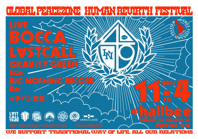 '11/11/4(Fri) 『49’IN GROBAL PEACE ZONE HUMAN REVIRTH FESTIVAL』@HALL BEE(福井) OPEN / 20:00 START / 20:30〜 CHARGE / 2000YEN with 1DRINK LIVE / BOCCA , LASTCALL , GRAViTY GREEN BGM / BIG MORNING RECORD Bar / イチバン食堂 http://tumblr.com/xfp4rz1q8m