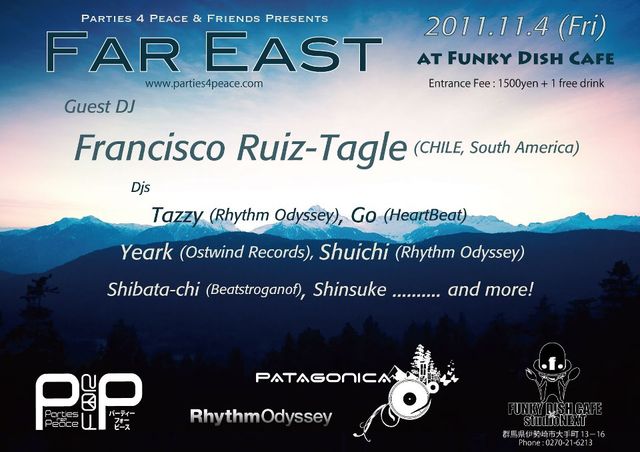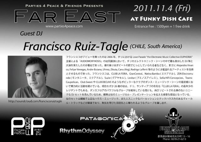 ::Parties 4 Peace & Friends Presents:: FAR EAST www.parties4peace.com ... 2011.11.4(Fri) at Funky Dish Cafe x Studio NEXT http://www.funkydish.from.tv/ Entrance Fee: 1500yen +1 free drink ::Guest DJ:: Francisco Ruiz-Tagle (CHILE, South America) http://soundcloud.com/franciscoruiztagle ::Djs:: Tazzy (Rhythm Odyssey) Go (HeartBeat) Yeark (Ostwind Records) Shuichi (Rhythm Odyssey) Shibata-chi (Beatstroganof) Shinsuke .......... and more! ::Francisco Ruiz-Tagle (CHILE, South America)