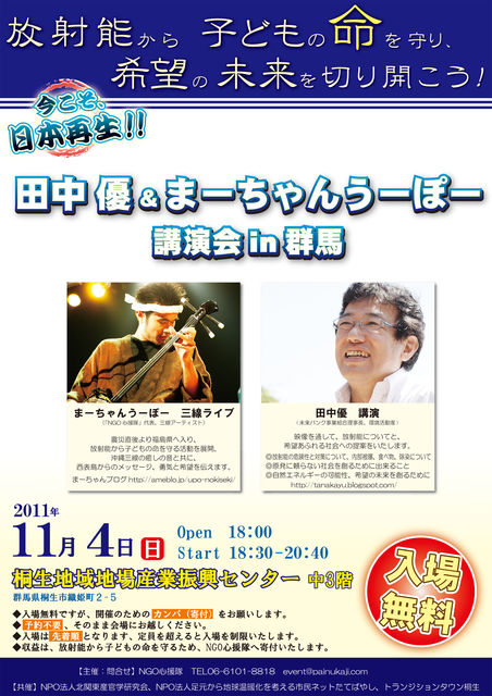 書き込み失礼いたします。 群馬でも、放射線量の高いところが見つかっています… そこで、真実と希望を伝えたいと、群馬でも開催が決まりました! ■□■□■□■□■□ ★☆★☆★☆★☆★☆ ◆田中優&まーちゃんうーぽー☆講演会♪ in 群馬 〜今こそ、日本再生〜 『放射能から子どもの命を守り、希望の未来を切り開こう』 ★☆★☆★☆★☆★☆ ■11月4日(金) 群馬県桐生市・桐生地域地場産業振興センター 中3階(280名限定) 18時:開場 18時半:開演〜20時40分 ◆入場無料ですが、開催のためのカンパ