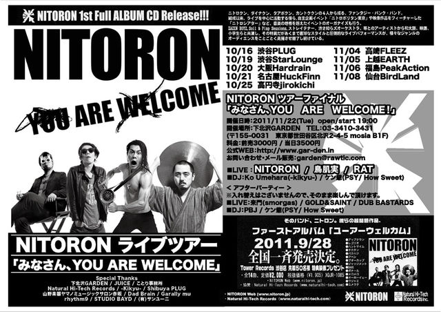 金曜日から後半戦突入いたします! 福島はカントククンの故郷。 東北地方をNITORONで周るのは感慨深いです。 みんなおいで。 そしてNITORONを感じて欲しい! ○11月4日(金) @群馬県 高崎FLEEZ OPEN:19:00 / START:19:30 前売:¥1500 / 当日:¥2000 NITORON / 新世 / etc... 【DJ】 Mahgary ○11月5日(土) @新潟県 上越EARTH 【LIVE】 NITORON(東京) case of identity ○11月6日(日) @福島県 郡山PEAK ACTION 「open the "more"」 open 17:00 start 17:30 前売¥1000 当日¥1500 (+1