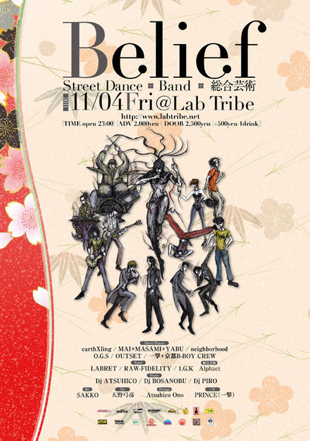 Street Dance、Band、総合芸術のMIX EVENT『Belief』 2011.11.4 Friday @KYOTO Lab Tribe OPEN 23:00 [street dance side] earthXling MAI+YABU+MASAMI neighborhood O.G.S OUTSET 一撃+京都B-BOY CREW [band side] LABRET RAW-FIDELITY 1.G.K [総合芸術 side] Alphact [DJ's] BOSANOBU ATSUHICO PIRO [MC] SAKKO [ART] 天野弓彦 [design] ATSUHICO [CM] PRINCE(一撃) [supported] ADRENA ALPHA audio lab B-TRIBE CATCLAW CLAUDIA DANCE ALIVE FLY DANCE STUDIO Homies UNION very