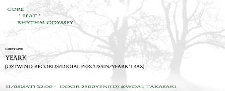 告知失礼します。 CORE' feat Rhythm Odyssey @woal takasaki 11/5(sat) 22:00~ door2500/1D w/f2000/1D Guest live YEARK (ostwind records/digial percussin/YEARK TRAX) support DJ ( Rhythm Odyssey) TAZZY shuichi GO (CORE) Nao(cotoridesk) / cotty(cotoridesk) / yunbo YEARK ostwind records/ digial percussin/ Resopai Schallware Rationalism records/ Irdial Music そして自身のレーベルYEARK TRAXよりリリースを重ねている。 彼の手がける楽曲は上質でありメロディック