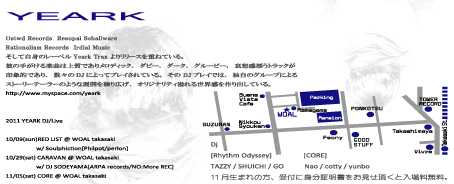 告知失礼します。 CORE' feat Rhythm Odyssey @woal takasaki 11/5(sat) 22:00~ door2500/1D w/f2000/1D Guest live YEARK (ostwind records/digial percussin/YEARK TRAX) support DJ ( Rhythm Odyssey) TAZZY shuichi GO (CORE) Nao(cotoridesk) / cotty(cotoridesk) / yunbo YEARK ostwind records/ digial percussin/ Resopai Schallware Rationalism records/ Irdial Music そして自身のレーベルYEARK TRAXよりリリースを重ねている。 彼の手がける楽曲は上質でありメロディッ