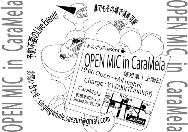 毎月第一土曜ですよ〜★ 次回、2011.11.5 (土) 19:00〜です!! オープンマイクは、All night!! 時間無制限!!いつ来ても、いつ帰ってもいいよ〜 オールナイトでやっちゃってもいいんだぜ〜(笑 ぞくぞくと参加者が増えてきてますので、 お時間延長させていただきます(笑 さまざまな方に出ていただいて、 さまざまなパフォーマンスをやっていただいて、 遊びに来ていただいた方々にとって 刺激的な時間を提供できたらと思ってます。 〜オープンマイクってなに??〜 アーティストよ、素人も玄人も集