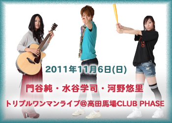 ライブ名:河野悠里ワンマンライブ 開場:東京・高田馬場CLUB PHASE(http://www.club-phase.com/) 開催日時:2011/11/6 12:00開場、12:30開演 チケット:前売り¥3000、当日¥3500(ドリンク代別) 出演:河野悠里、他。 この日のワンマンはゆりりんワンマン2Daysの2日目です! この日では、何か新しいことある悪寒。。。。じゃないな、予感やわ。(^^; 今回は、カドジュンと学司兄とのトリプルワンマンです。 しかも、今回のワンマンはお昼からなので、時間をお間違えのないようにしまし