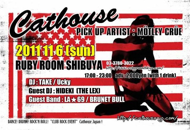 告知失礼致します。 毎回ゲストバンドを迎えて月イチで開催しているクラブロック・イベント「Cathouse Japan」(ファスター・プッシーキャット、テイミー・ダウン公認イベント) ちょうど来日から一月遅れではありますが、次回11・6日はモトリー・クルー・スペシャルでお送りします。 内容はDJタイムとLIVE、そして映像とモトリーを大フューチャーします!! 以前モトリー特集をした際にはニッキーよりビデオ・レターも頂きました ライブハウスとはまた一味違うクラブならではのお洒落な空間でのモトリーイベントで、お客さ