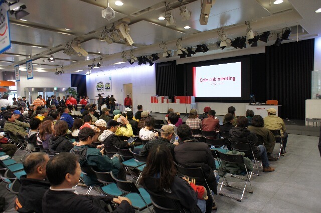 http://www.honda.co.jp/welcome-plaza/event/2011/20111106/ 「第15回 カフェカブミーティング in 青山」 進行予定 ◇開催日 2011年11月6日(日) ◇時間 9:00 マシンエントリー受付開始 11:00 受付終了 12:00 「カフェカブコンテスト」人気投票 締め切り 13:00 「バイクフォーラム」 ゲスト:藤原かんいち さん 15:00 コンテスト表彰式 16:30 終了予定 ※コンテストにエントリーされる方は、下記の参加申込み誓約書をご記入の上、当日お持ちください。 →参加申し込み誓約書(PDF) http://www.honda.co.jp/welco
