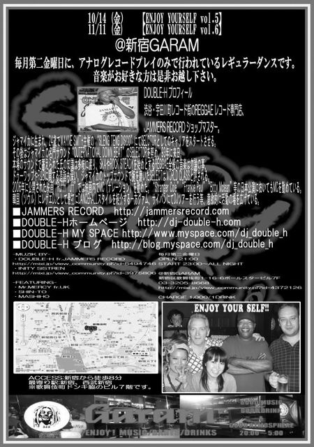 管理人様、告知失礼致します。 11/11(金) @新宿GARAM 【ENJOY YOURSELF vol.8】 -RECORD PLAY ONLY- 毎月第2金曜日に、アナログレコードプレイのみで行われているレギュラーダンスです。 音楽がお好きな方は是非お越し下さい。 -MUZIK BY- ・DOUBLE-H fr.JAMMERS RECORD http://mixi.jp/view_community.pl?id=5494746 ・INITY SISTREN http://mixi.jp/view_community.pl?id=3975806 -FEATURING- ・Mr.MERCY fr.UK ・RUM COKE ・SHIN-TO ・MASHIHO ・HAJIME and more friends 毎月第2金曜日開催