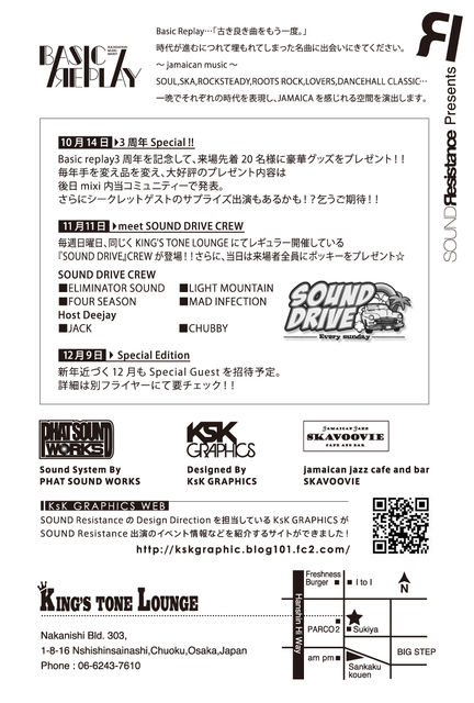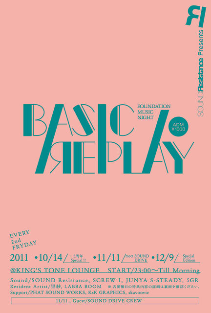 SOUND Resistance Presents… 『Basic replay』 〜 meet SOUND DRIVE CREW 〜 2011.11.11(FRI) @KING'S TONE LOUNGE START 23:00〜Till Morning ADM:\1,000 GUEST Artist/ SOUND DRIVE CREW SOUND/ SOUND Resistance . SCREW I . JUNYA S-STEADY . 5GR Resident Artist/ 里紗 . LABBA BOOM Food/ skavoovie Supported by… PHAT SOUND WORKS, kskgraphics 〜※〜※〜※〜※〜※〜※〜※〜※〜※〜※〜※〜※〜※〜※〜※〜※〜※〜※〜※〜※〜※〜 Basic Replay…「古き良き曲をもう一度。
