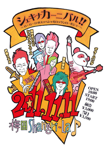 恒例になってきた!? シャングリラでのシェキナカーニバル!! 今年も素敵な夜になる… 10/1〜チケット販売開始!! 物販でもチケット販売予定♪ 友達誘ってめっちゃ楽しみに来て下さい♪ ●11/11(金)梅田『シャングリラ』 シェキナカーニバル!! 〜11・11・11のスッペシャルロックンロールショー〜 ●出演 ・高木まひことシェキナベイベーズ ・伊東ミキオ ・ギターパンダ(山川のりを) ・延原達治(THE PRIVATES) 格好良くなる事間違いないね!! ●OPEN18:00/START19:00 ●前売¥3000/当日¥3500(共にDrink代別) 【