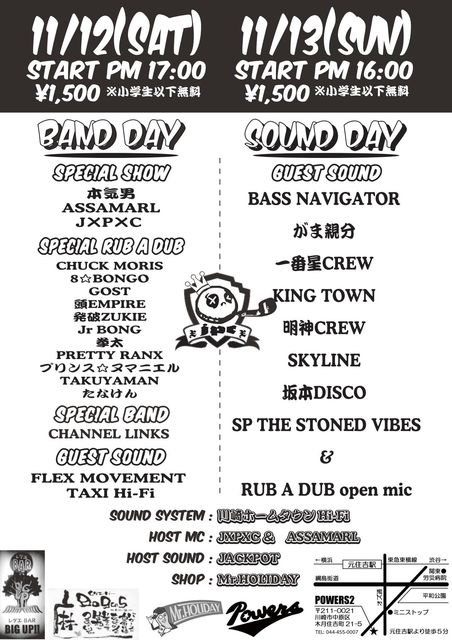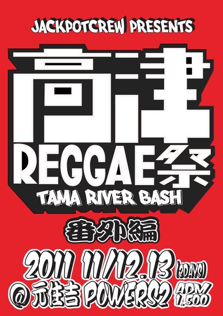 高津レゲエ祭〜バンド編〜 11月12日(土曜日) オープン17:00 ¥1500(※小学生以下無料) ゲストサウンド ・FLEX MOVEMENT ・TAXI Hi-Fi スペシャルショウ ・MAJIMAN・ASSAMARL・J×P×C スペシャルラバダブショウケース ・CHUCK MORIS ・8☆BONGO ・GOST ・頭EMPIRE ・発破ZUKIE ・Jr BONG ・拳太 ・PRETTY RANX ・プリンス☆ヌマニエル ・TAKUYAMAN ・たなけん ホスト・ASSAMARL & J×P×C バンド・CHANNEL LINKS サウンドシステム・川崎ホームタウンHi-Fi ショップ・MR.HOLIDAY