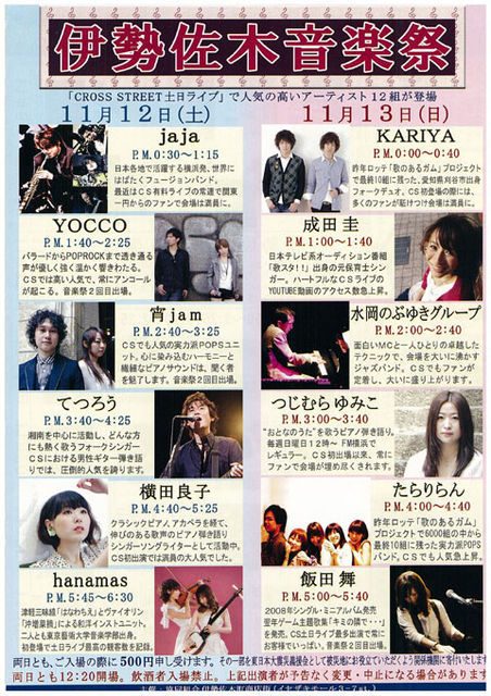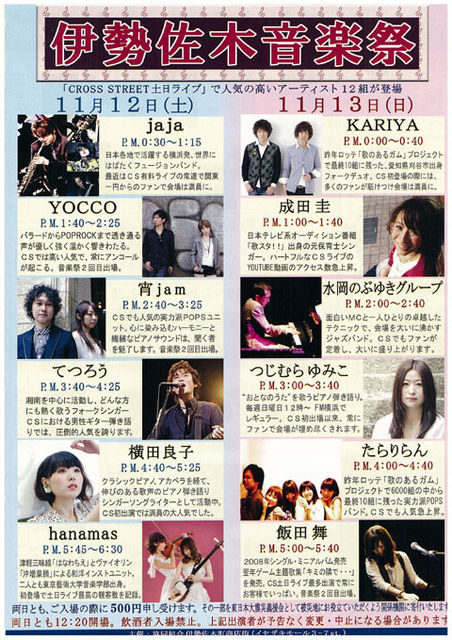 2011.11.12(土) 【hanamas】 http://ameblo.jp/hanamas-blog/ 「伊勢佐木音楽祭」 場所:CROSS STREET isezaki 時間:開場 12:20 / 開演 12:30 (hanamasの出演時間は17:45〜18:30です☆) 料金:¥500 (収益の一部を東日本大震災義援金として被災地にお役立ていただくよう関係機関に寄付いたします) 出演: jaja yocco 宵jam てつろう 横田良子 hanamas ★CD販売あり!