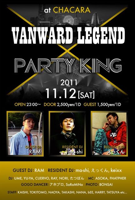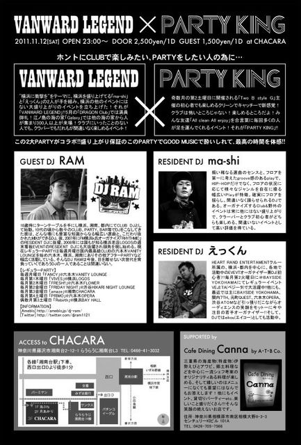 管理人さま失礼します あの衝撃を与え続けてるBIGイベントと、勢いある若手のイベントが今回特別にコラボ 湘南台CHAKARA! 満員御礼確実 普段クラブに行かない人でも、毎週行ってるクラバーでも DJ onlyでばっちり踊れます 入り口で『まーしーのゲスト』でディスカウント価格で入れます 11/12(土)23:00〜 Vanward Legend × PARTY KING@湘南台CHAKARA ホントにCLUBで楽しみたい、PARTYをしたい人の為に・・・ Vanwar