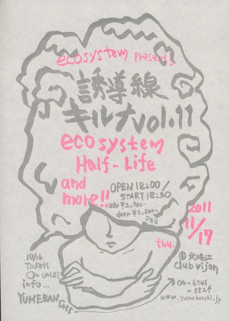 2011年11月17日(木) 北堀江 club vijon http://vijon.jp/ ecosystem presents 誘導線キルナ vol.11 出演 ecosystem Half-Life serial TV drama nano.RIPE OPEN 18:00 / START 18:30 TICKET adv \2,300 / door \2,800 (+1drink) ※ecosystem HP先行受付あり http://www.sonymusic.co.jp/Music/Arch/SMER/ecosystem/?info プレイガイド取り扱いあり(10月16日〜一般発売開始) チケットぴあ(0570-02-9999) Pコード:151-722 ローソンチケット(0570-084-005) Lコード:52058 e+ http://eplus.jp/sy