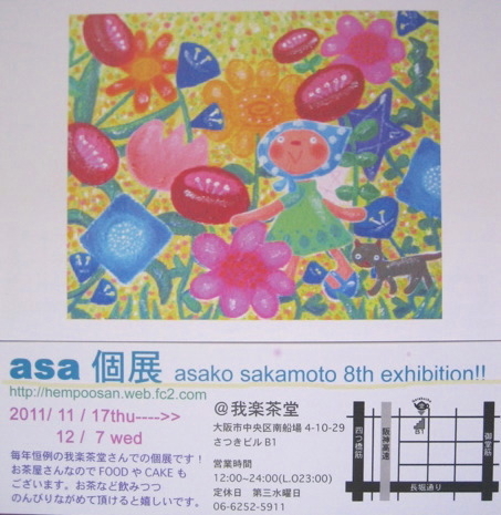 *2011/11/17(木) ----->> 12/7(水) 個展やりまーーす!!! 今回は、オブジェも増えてます! オリジナル絵本原画も少し展示予定です! 場所:我楽茶堂 http://r.gnavi.co.jp/k975200/ 大阪市中央区南船場4-10-29 さつきビルB1 06-6252-5911 お時間ありましたら、是非是非遊びにきて下さい!! ヨロシクお願いいたします!!! *注* 11/27日はLIVEの為 cafe営業は17:00までです。 11/20日,12/1木も FREE LIVEがありますがcafe営業していますので絵もご覧いただけます。