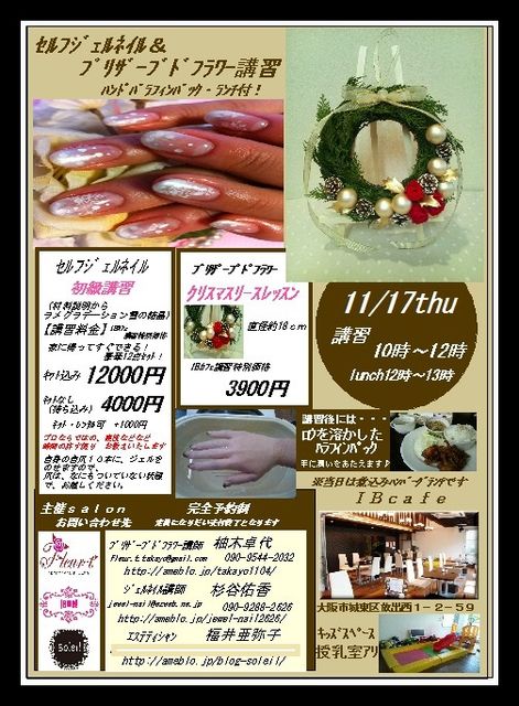 ***セルフジェルネイル☆プリザーブドフラワーのクリスマスリース*** cafe講習会の開催決定いたしました !! 2011/11/17木曜日 時間☆10時〜13時 場所☆IBカフェ(場所などの詳細は下記にございます) とってもお得な ハンドパラフィンパック ワンプレートランチ付 キッズスペースがありますので、お子様連れ大歓迎です ----------セルフジェルネイル初級講習------------- 講師杉谷 佑香 JNA日本ネイリスト協会 1級 バイオスカルプチュア上級デ
