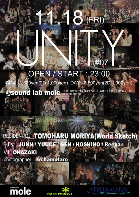 ☆11月18日(金)☆ UNITY@Sound lab mole OPEN23:00 ADV : 1,500yen (2D 1,000yen) DAY : 2,000yen (2D 1,000yen) ☆☆行く人は、連絡下さい! 特典? ご入場は通常なら3000円2Dですが、受付にてDJYUUCEまたはゆうたの名前で特別価格で入場頂けるディスカウントをご用意致します 特典? MIX CDを先着50名にプレゼント おおまかなご来場予定の人数と代表者様のお名前を明記しまして、お気軽にメッセージ下さい ☆☆ RESIDENT DJ : Tomoharu Moriya (World Sketch)