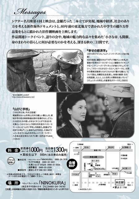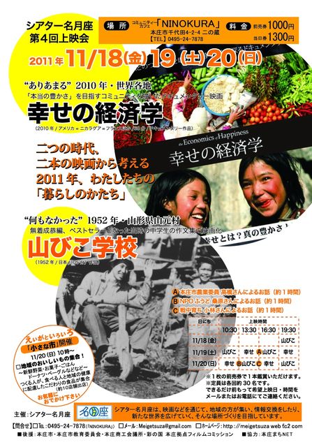“ありあまる”2010年世界各地と“何もなかった”1950年代山形を描いた二本立てで私たちの「暮らしのかたち」を考えます。 ●プログラム(1作品につき、前売1000円、当日1300円、高校生以下500円) 『幸せの経済学』(2010年、アメリカ、ニカラグア、フランスほか) 『山びこ学校』(1952年、日本) 10:30 13:30 16:30 19:30 18(金) - - - 山 19(土) 山 幸 山 幸 20(日) 幸 山 幸 山 できるだけ、お電話、メールで観賞日時をご予約ください。 ご予約の方
