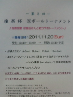 第3回撞楽杯?ボールトーナメント ☆開催日時☆2011,11,20(Sun) 受付12:30〜13:00→開始13:30予定 ・ 対象クラス/ A-5set B-4set C-3set Lbe-2set ・ エントリーフィー/¥2.000-(賞金1〜3位まで/Wイルミネーション裏側1set down/3位決定戦あり) ・ ルール/テキサスエキスプレス ※交互ブレイク制、シュートアウトナシ、ダブルヒットアリ(コール制)、3ファールアリ(相手が2ファールよりカウントした場合に適用) *当日の13時までの受付は店外入り口で行います。 *会場の使用時間が13:00〜19:00 まで