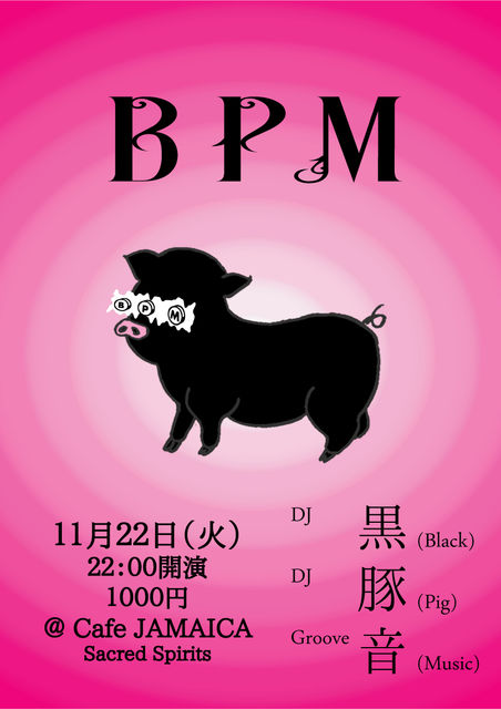 告知失礼します!! お見逃し無く!なParty情報です! *************************** 11月22日(火) @Cafe JAMAICA 『B P M』 (B lack P ig M usic) 22:00〜 1000円 DJ 黒 DJ 豚 ************************** 12月9日 10日(金 土) @ENJOINT BAR COVER 『おかげさまで5周年!!感謝祭』 20:00〜 0円 9日 DJ 清 、黒 、墨 、豚 10日 DJ OSAKU MASASHI 、