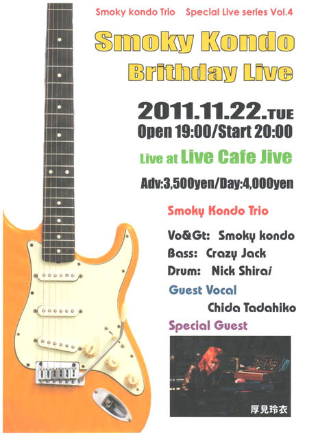 Smoky Kondo Birthday Live Smoky Kondo Torio with 厚見玲衣 2011年11月22日(火)(次の日勤労感謝の日でお休みです♪) charge 前売\3,500 当日¥4,000 Open>19:00 Start>20:00 場所:Live cafe jive 〒730-0027 広島市中区薬研堀2-13 TEL&FAX 082-246-2949 http://livecafe-jive.com/hp Vo/Gu:Smoky Kondo Bass:Crazy Jack Drums:Nick Shirai Guest:千田忠彦[Vo] Guest:厚見玲衣(key)(exBOW WOW、SENCE OF WONDER、CASINO DRIVE、忌野清志郎、etc) 今年のSmokyKondoのBirthdayLIVEも超豪華です!