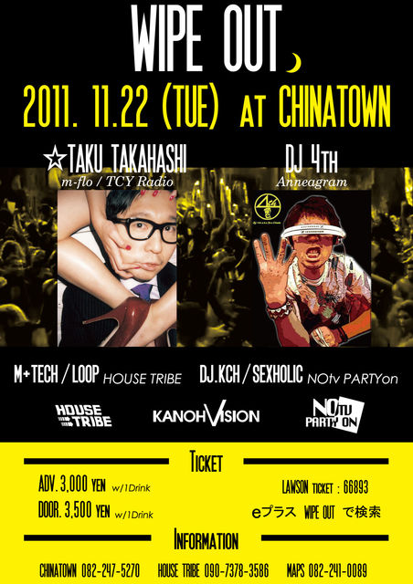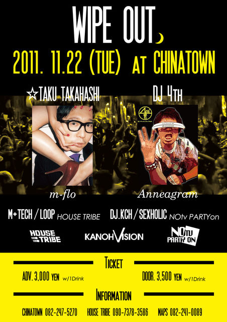 書き込み失礼致します。 国内トップDJが広島チャイナタウン11/22(祝日前火曜日)で共演。 まず一人はm-floとしての活動は勿論remixワークでTOPプロデューサーの地位を確立している☆TAKU TAKAHASHI。 もう一人は俳優"岡田義徳"としての活動とは一線を引き、国内外のトップDJ達と数々の共演を果たすDJ 4th。 昨年は全国13都市にて初のDJツアーを実施し、約一万人の動員を記録した! 音楽性のスキルの高いトップアーティストが共演するNew Party "WIPE OUT" 貴重な機会を是非お見逃し無く チケットはローソンチケット、又はeプラスにて絶