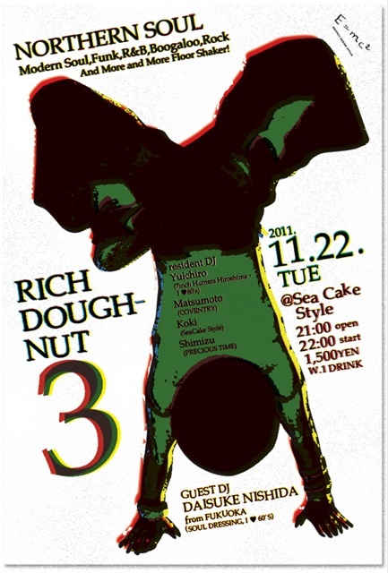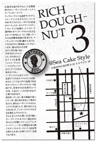 RICH doughnut 広島市は流川を中心に不定期開催中のノーザンソウルオールナイター!! モッズムーヴメントも過ぎサイケデリックムーブメントも去ろうとしていた1967年ごろのこと。イギリスの北部はマンチェスターのクラブ「ツイステッド・ホィール」で毎週オールナイターで踊り明かすアンダーグラウンドな文化がかつてありました。そこで踊っていたのは労働者階級の若者たち。マンチェスターからと多く離れた者でも、このためだけに毎週通っていたといいます。彼らが好んだ音楽はテンポの速い60〜70年代のソウルでした。そのほとんどがアメリカ