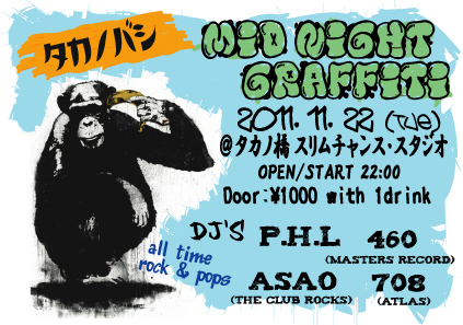 管理人様、告知失礼します。 前回、好評を博したTMGが決まりました! 皆様、日々の労働の鬱憤を晴らしてやりましょう! だって次の日は勤労感謝の日! 2011.11.22(火・祝前日) タカノバシ Midnight Graffiti ALL TIMES ROCK&POPS!!! @スリムチャンススタジオ http://slimchance.exblog.jp OPEN/START 22:00 \1000 w/1drink DJ:P.H.L 708 ASAO 460