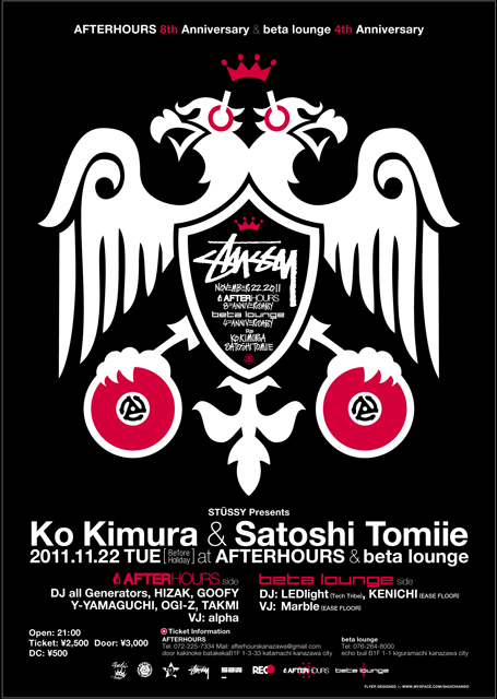 "Stussy Presents" Ko Kimura & Satoshi Tomiie ~AFTERHOURS 8th Anniversary & beta lounge 4th Anniversary~ After Hours 8周年 とbeta lounge 4周年を記念して 11月22日に両店舗合同記念パーティーが開催されます! ゲストDJは日本を代表する2人 Ko Kimura & Satoshi Tomiie!!!! そして世界的ブランド”Stussy”がバックアップとこれ以上ない贅沢な夜です。 この金沢でしか見ることのできないエクスクルーシブな一夜を 絶対見逃さないでください!!! 開催日:2011.11.22 (TUE) 祭日前 開催場所:AFTERHOURS &