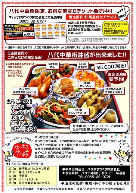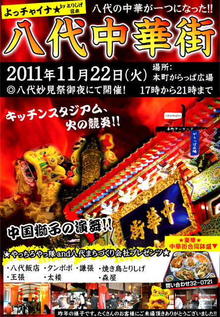 ☆妙見祭御夜の日のイベント案内です☆ 今年も八代中華街を妙見祭御夜の日に開催いたします! 今年はさらにパワーアップ★w(゚ロ゚;w(゚ロ゚)w;゚ロ゚)w 詳細は下記をごらんくださいませ★ -*-*-*-*-*-*-*-*- ★八代妙見祭御夜★ 【八代中華街】 11/22(火)17時〜21時 場所:本町アーケード内がらっぱ広場 ★中華街出店★ ・八代飯店 ・タンポポ ・王張 ・太楼 ・謙張 ・とりしげ ・森屋 ■パワーアップ1【中華街限定鉢盛り】 ・6店舗のお店が合同で1つの鉢盛りを作る特別企画。 みんなが集まるこの