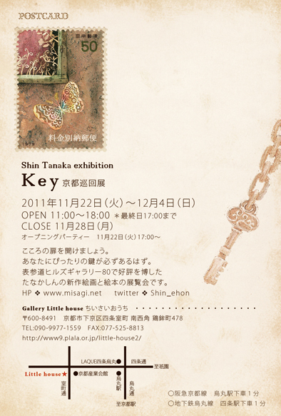 「Key」巡回展のお知らせです!! 9月に東京で発表された 『Key』をテーマに描かれた絵画を中心に 新作数点を加えた作品展が京都で開催されます。 絵本、ポスター、ポストカード、カレンダー Gパンだぬいぐるみなど、グッズも展示販売されます。 鍵と鍵穴の関係と、作品と鑑賞者の関係はとても似ています。 合う鍵と合わない鍵があるように、 作品にもこれだという一枚が存在します。 心の扉を開けるような作品を見つけにきてください。 (ブログ「たなかしんの絵本」より) たなかしん作品展『Key』巡回展 2011年11月22日(火