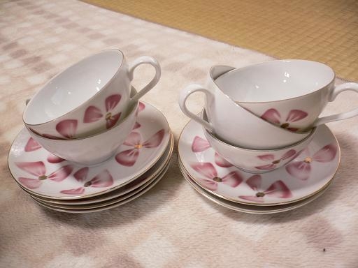 引越に備えて、家のモノを整理しています。 このカップは多分30年以上前のものではないかと思います。 子どもの頃は来客時に何度か使っているのを見ましたが、 今では奥にしまわれて、全く使われていません。 (我が家はコーヒーや紅茶を飲まないのです^^;) 捨てようかと思ったのですが、こういうレトロな茶器が好きな方も いるかもしれませんし、基本出来る限りゴミにしたくないので こちらに出してみます。 ソーサーが6枚でカップが5個なので、 おそらくカップは一個割れたのでしょう。 大きな傷はありませんが、経年によるく