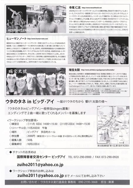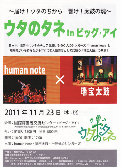 知的障がいというハンデを乗り越え、全国2位に輝いたプロの和太鼓集団『瑞宝太鼓(ずいほうだいこ)』さんと human note http://www.human-note.com/htdocs/?action=pages_view_main&page_id=13のコラボレーションコンサートが決定しました! 瑞宝太鼓さんのH.Phttp://www.airinkai.or.jp/jigyosyo/zuihoutaiko/index.html 一般参加シンガーの募集を開始いたしました! http://www.human-note.com/htdocs/?page_id=116