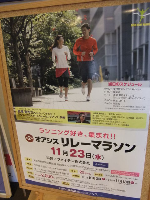 11月23日(水・祝)にオアシスリレーマラソンが開催されますね。 聞くところによると、 今年も「クラブウエストチーム」で参加が予定されているようです! 詳しくは、フロント(波江野サブマネージャー)まで! 現在、種本さんの写真とともにチームの募集が始まっています。 この日に福知山マラソン、20日神戸マラソン、12月4日に奈良マラソンなどフルマラソンも目白押し。 ハーフや10kmなどもありますが、2,8km走ってみませんか? 期限は11日まで(だったと思うw)