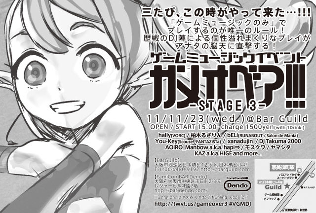っつー訳でまたやります! --- ―三たび、この時がやって来た…!!!― 「ゲームミュージックのみ」でプレイするのが唯一のルール! 歴戦のDJ陣による個性溢れまくりなプレイがアナタの脳天に直撃する! --- ガメオベア!!! STAGE3 @Bar Guild [http://barguild.com/] 2011/11/23 (wed.) Open/Start 15:00- charge: 1,500yen(with 1Drink) ♪gamemusic [ DJs ] AOiRO_Manbow a.k.a. hapi⇒ @hapinano bELi (RUNABOUT / Salon de Mania) @cure_bELi DJ Takuma 2000 @DJTakuma2k FCVDJ-ARM @fcvdjarm You-Key(Scouse!, FANTA
