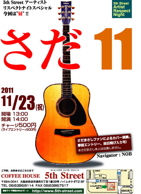 11月23日(水・祝) 会場 吹田5th Street 開場 13:00 開演 14:00 チャージ 500円(ステージエントリー+500円) さだまさしファンによるカバー演奏。 事前エントリー、当日飛び入り可。 ※さだまさし本人は出演しません。 Coffee House 5th Street 大阪府吹田市泉町5丁目1番39号 ハイムタケダT2 BF TEL 06(6386)9114 http://www.5th-street.com/