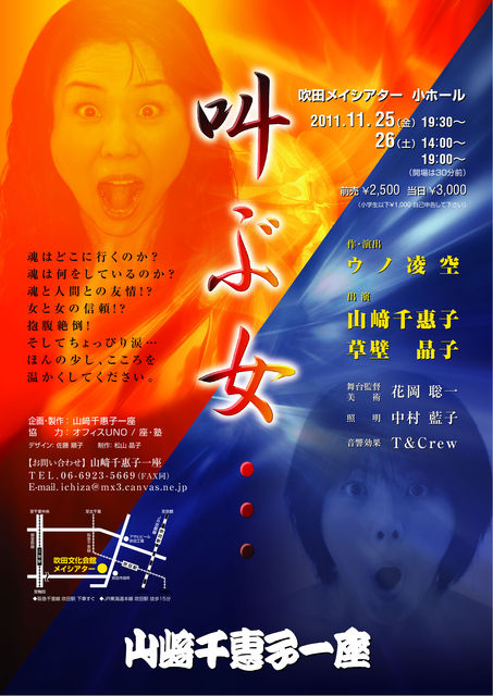 山崎千惠子一座の草壁です。 もう来週になるのですが、芝居の宣伝です 山崎千惠子一座 2011 「叫ぶ女・・・」 11/25 (金) 19:30〜 26 (土) 14:00〜・19:00〜 吹田メイシアター 小ホール 前売 2,500- 当日 3,000- 私が一座に入団して、10年が経ちます。 早いもんです 学生の時は、ただ凄いと遠い存在やった一座。 何故かお誘いを受け、入団。 座長達に反発しながらも同じ舞台に立ちたいと走って。 立てる様になっても、足を引っ張るだけで、怒られてちっとも面白くなかった。 一緒に絡める訳も