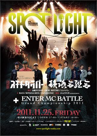 毎年お馴染み、 韻踏合組合主催のこのイベント!! エムラスタ 今年も総合司会を務めさせていただくことに なりました!! そして今回のゲストはなんと スチャダラパー!! もちろん、 年間チャンピオンを決めるMCバトルもありますよ!! 11月25日です!!! そしてそして、 SPOTLIGHTのホームページも開設 http://www.spotlight-osaka.com/index.html おたのしみに