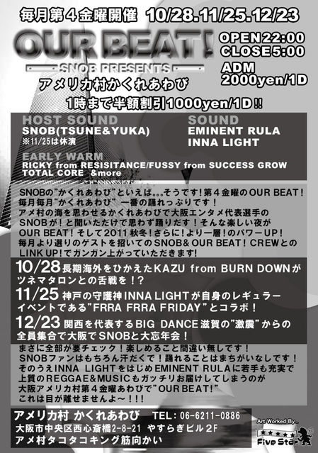 毎月第4金曜日の大阪ミナミの めっさ踊れる鉄板ダンスホールといえば・・・ 大阪が世界に誇るエンターテナー 【SNOB】が主催する <OUR BEAT @かくれあわび> 今回はOUR BEATファミリーの一員 INNALIGHTが6年間キープし続けてる フラフラの愛称でおなじみの 神戸の人気ダンス『Frra Frra Friday』との コラボSPECIAL★ レギュラー陣に加え、マンスリーサウンドの 岡山エビス工業&枚方SHY HIGHの フラフラ ファミリーも加わっての えらいこっちゃNIGHT♪♪ 神戸のフラフラはええ曲満載なんはもちろん、 お酒もえげつなく飛