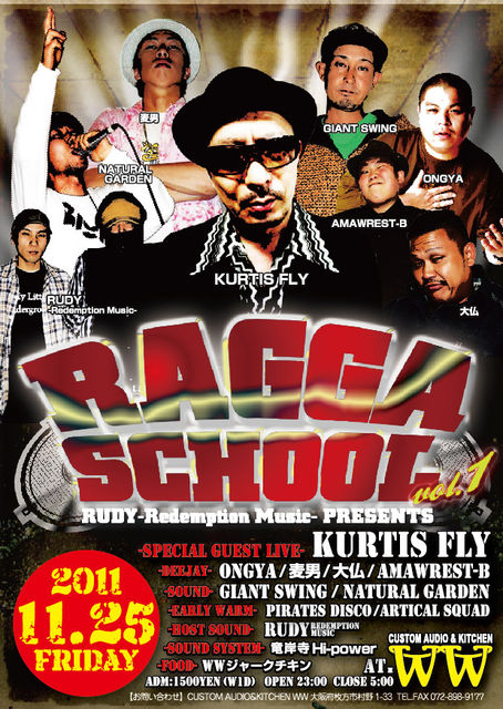 ☆ラガスク☆ 開催決定!!!!!!! ラガな人達による、ラガな人達のための、ラガな枚方で100%ラガな夜間学校が開校決定!! 第一回目の特別講師には皆さんご存知、京都から『KING KURTIS FLY』 そして奈良からは『GIANT SWING』とHost Sound 『RUDY -Redemption Music-』 が登場! さらにラガスクならではの特別教材 『竜岸寺Hi-power SoundSystem』 も入ります! 気になる教室は枚方のラガスポット『WW』 爆音で朝まで楽しめる熱い夜になる事間違い無し!! ぜひ皆さんの出席お待ちしております。 2011/11/25(金)